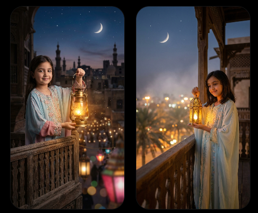 تخيلي معي: فتاة تقف في شرفة منزلها القديم، خيوط الضوء الذهبي المنبعثة من فانوسها النحاسي تنعكس على ملامحها الهادئة، بينما يلوح هلال رمضان في الأفق البعيد. هذا المشهد ليس مجرد خيال — بل هو برومبت حي يمكنك استخدامه الآن.